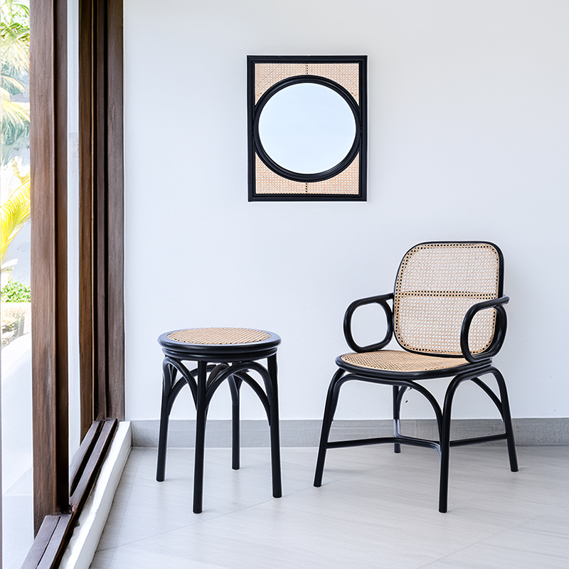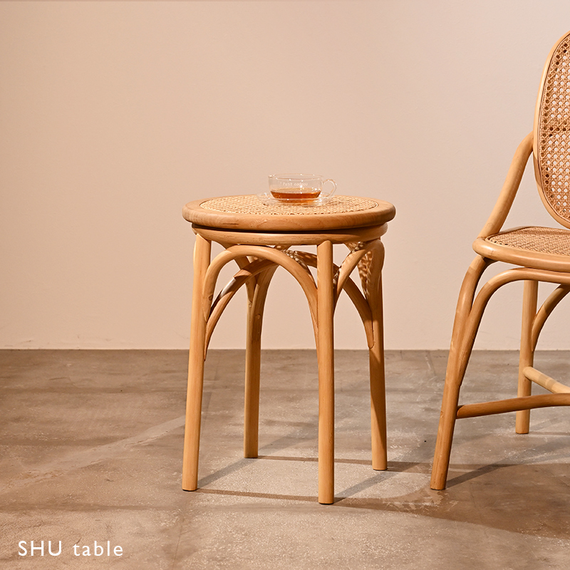 無垢材とラタンを組み合わせた繊細なデザインは、空間にやさしいアクセントを加えます。