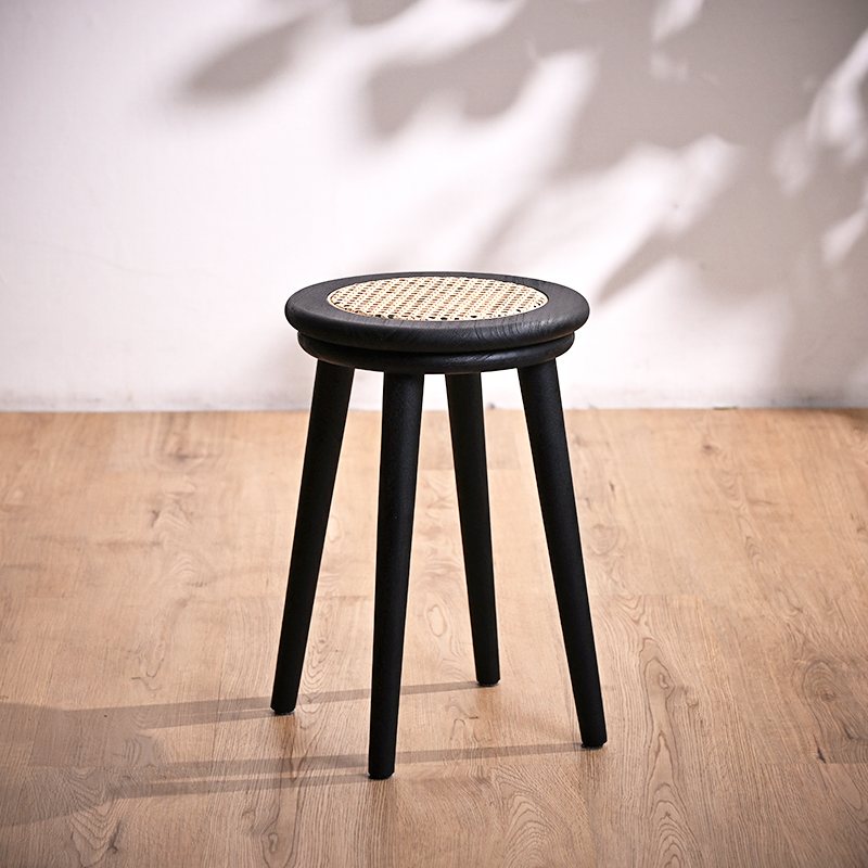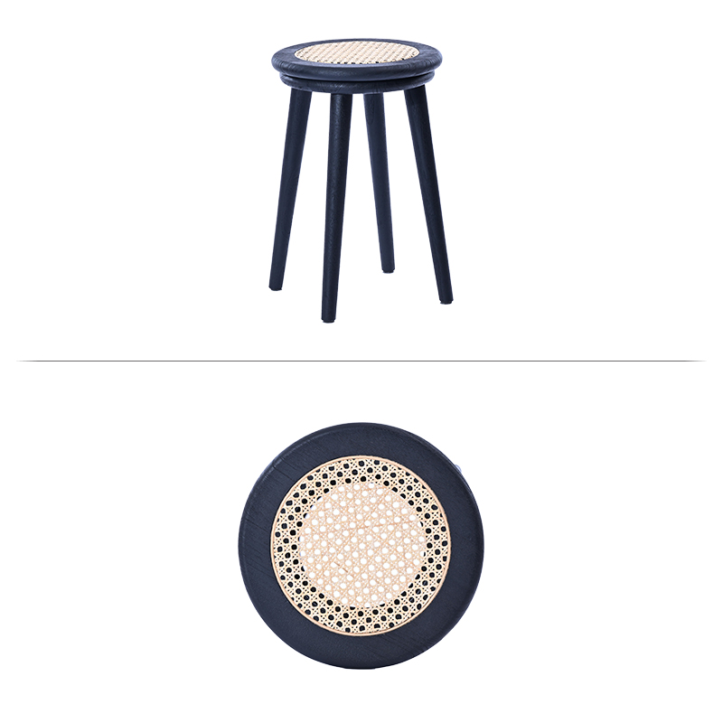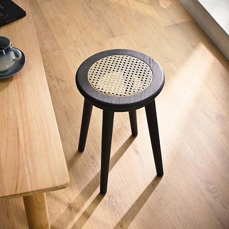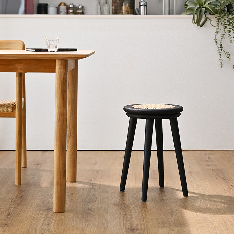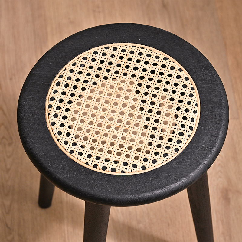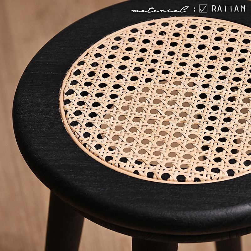 シャープな印象で重厚感のある黒の木肌と、ナチュラルカラーのラタンとのコントラストがおしゃれなスツール。